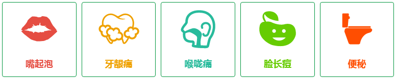 癥狀:牙齦腫痛、口腔潰瘍、咽喉腫痛、便秘、臉長(zhǎng)痘。